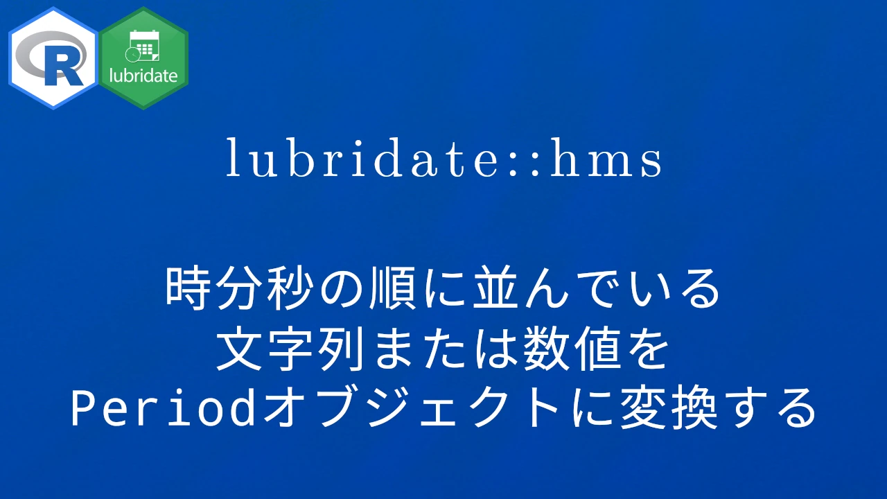 R言語で、時分秒の順に並んでいる文字列または数値をPeriodオブジェクトに変換する方法について解説します。時間に関する処理はtidyverseパッケージに含まれているlubridateパッケージを使うのがとても便利です。ここでは、lubridateパッケージのhms()の使用方法についてお伝えします。