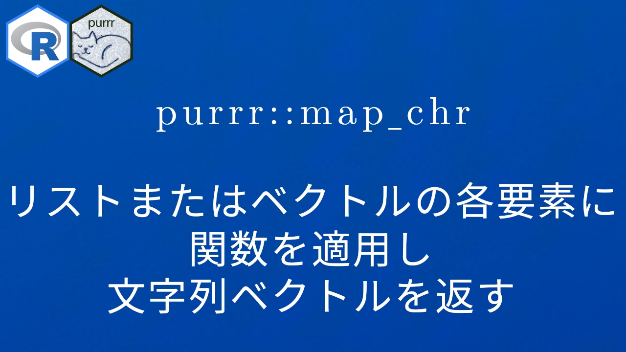 R言語で、リストまたはベクトルの各要素に関数を適用し文字列ベクトルを返す方法について解説します。ここではtidyverseパッケージに含まれているpurrrパッケージのmap_chr()を使用した方法についてお伝えします。